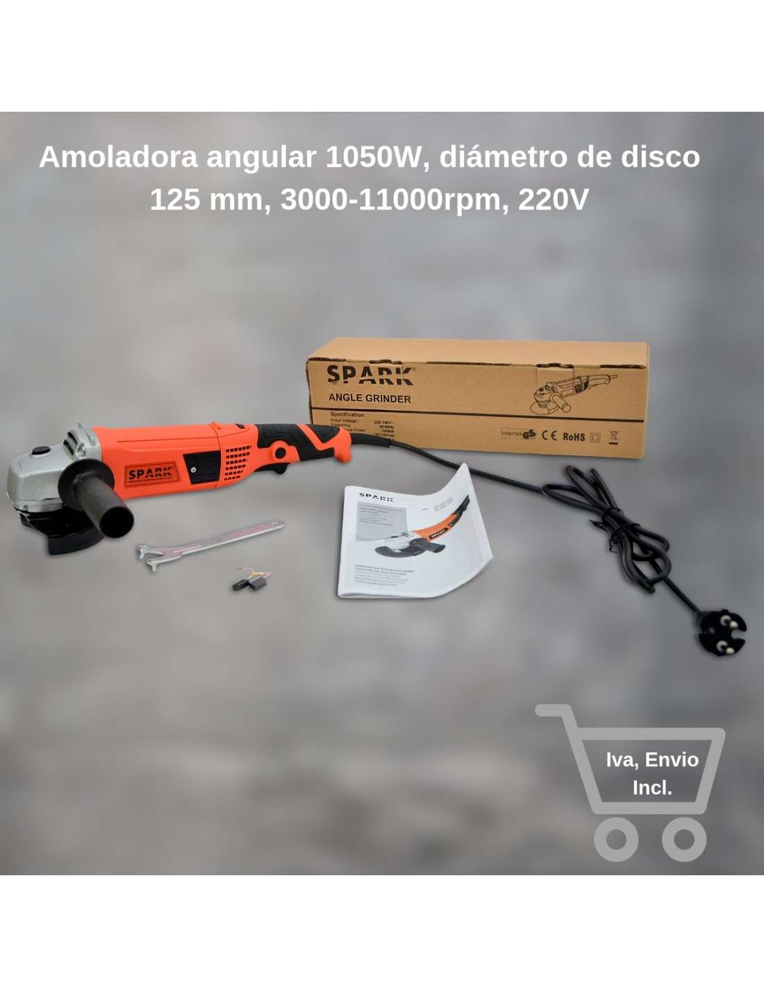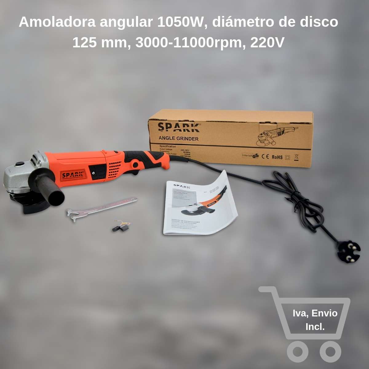 Spark - Amoladora angular 1050W, diámetro de disco 125 mm, 3000 - 11000rpm velocidad variable, 220V, mango auxiliar regulable