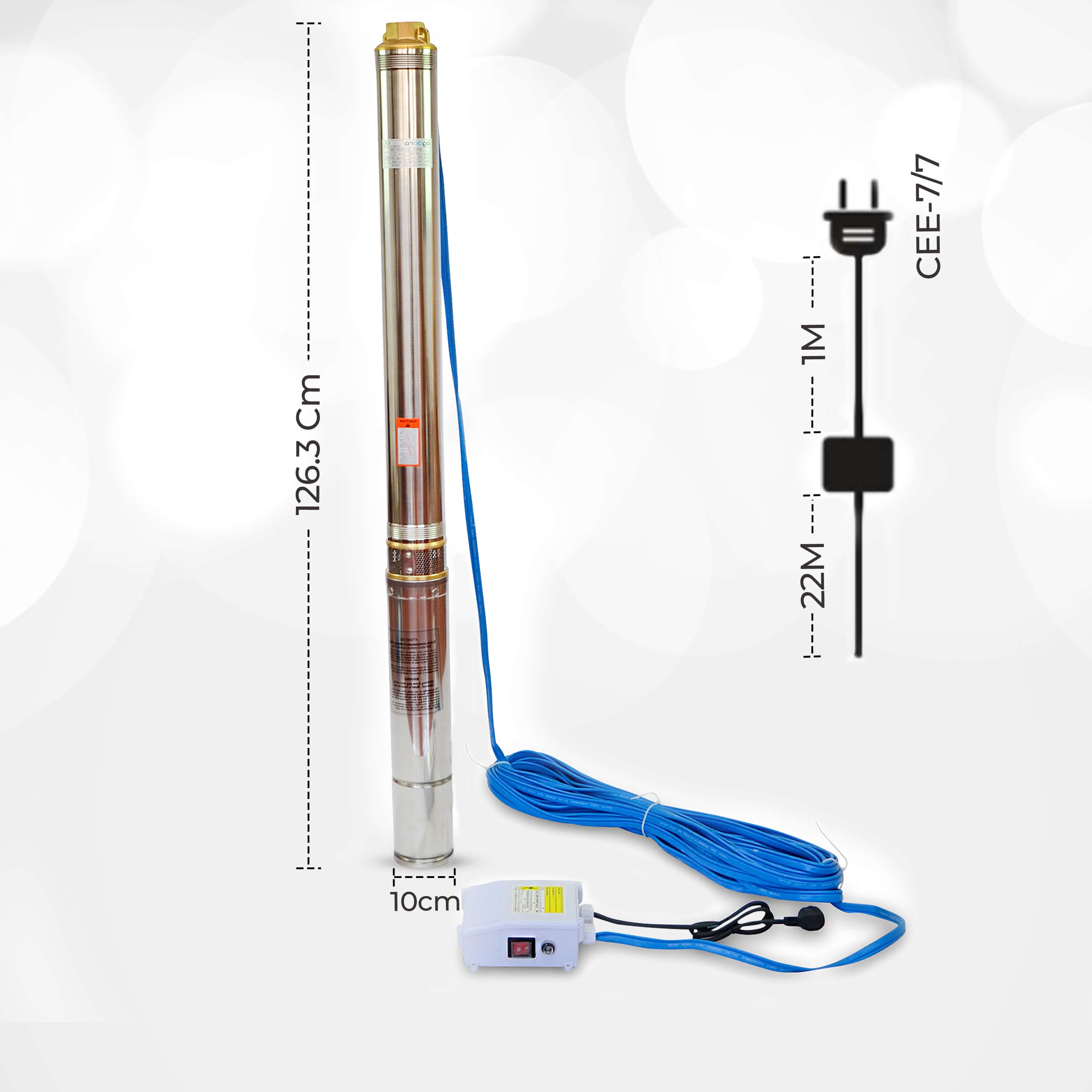 El recubrimiento exterior de la bomba está elaborado en acero inoxidable para evitar su oxidación al frecuente contacto con el agua. También cuenta con un cable extensor de 20 metros de alta resistencia que permite enlazar la bomba con su panel de encendido eléctrico. Ya que dispone de su propio botón de encendido y apagado para funcionar cuando más se necesita.