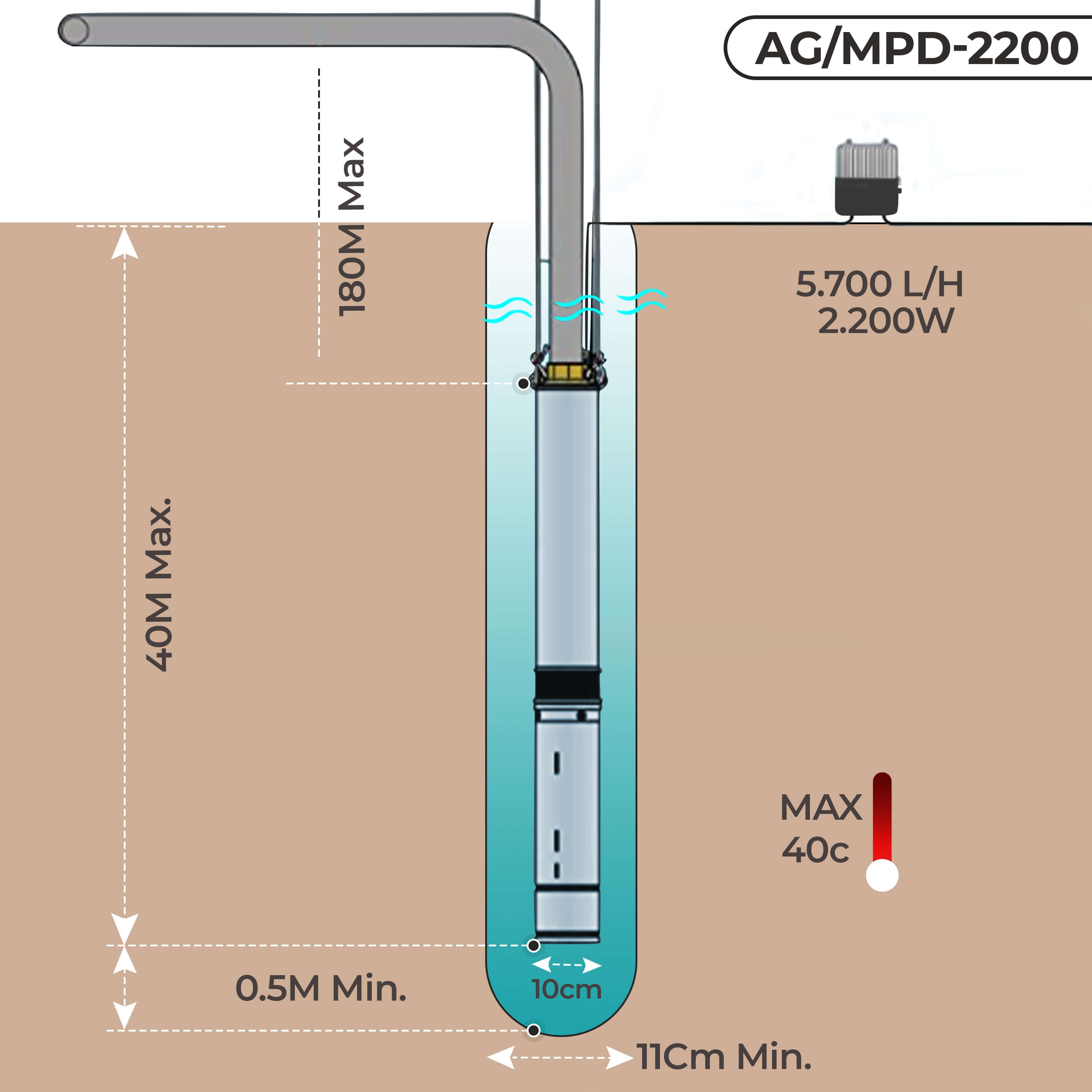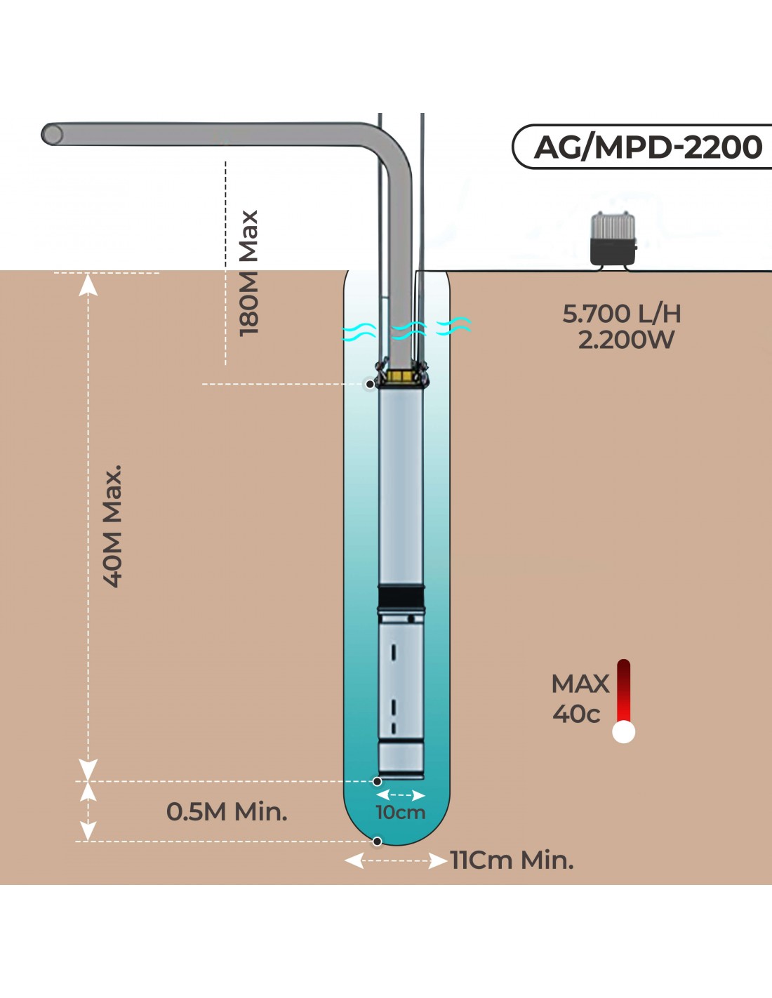 ALTO RENDIMIENTO: esta bomba está diseñada para pozos profundos ya que es capaz de transportar agua de pozos de hasta 40m de profundidad gracias a su motor de 2200W que permite un flujo de agua de 5.7m3/h