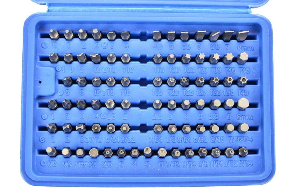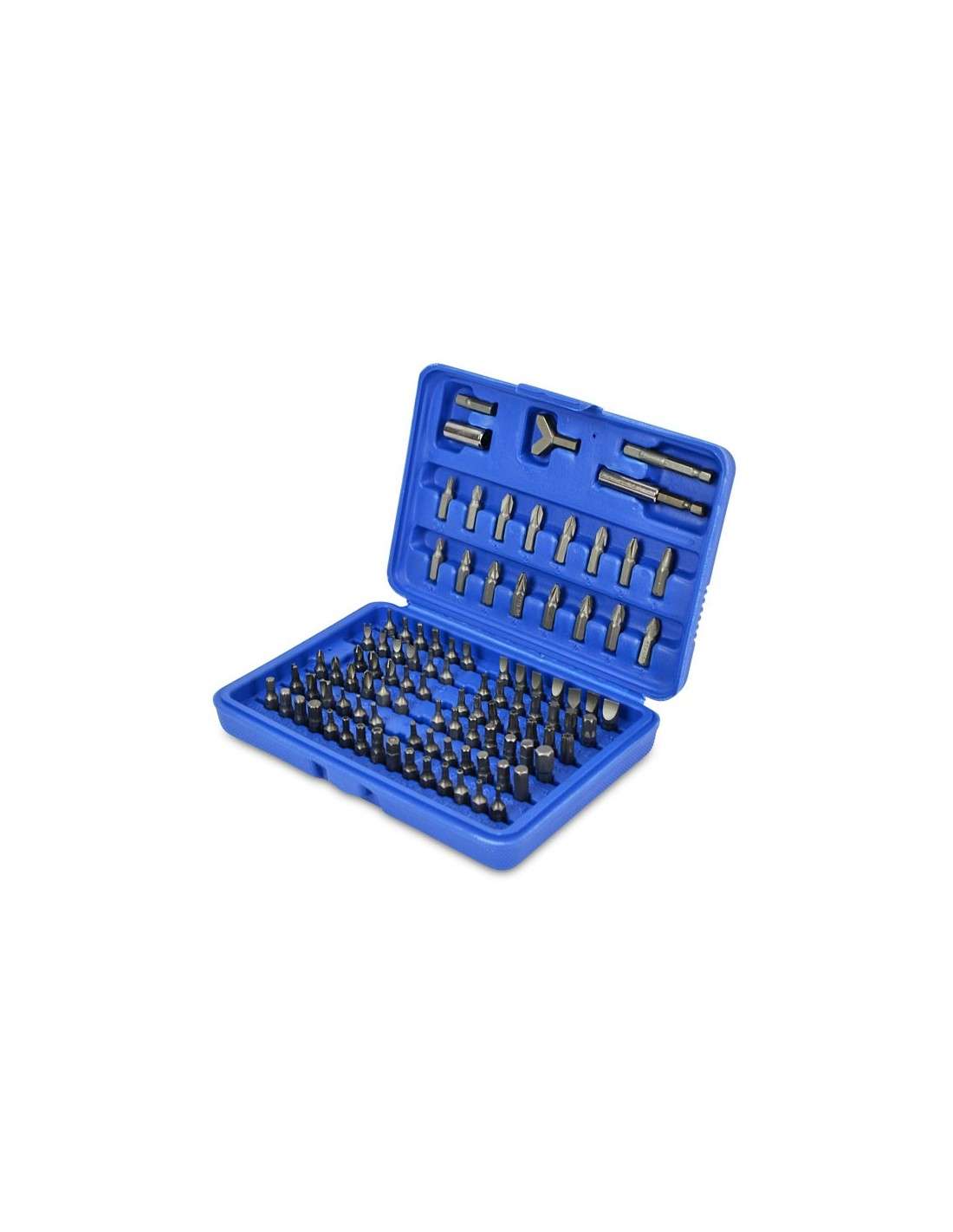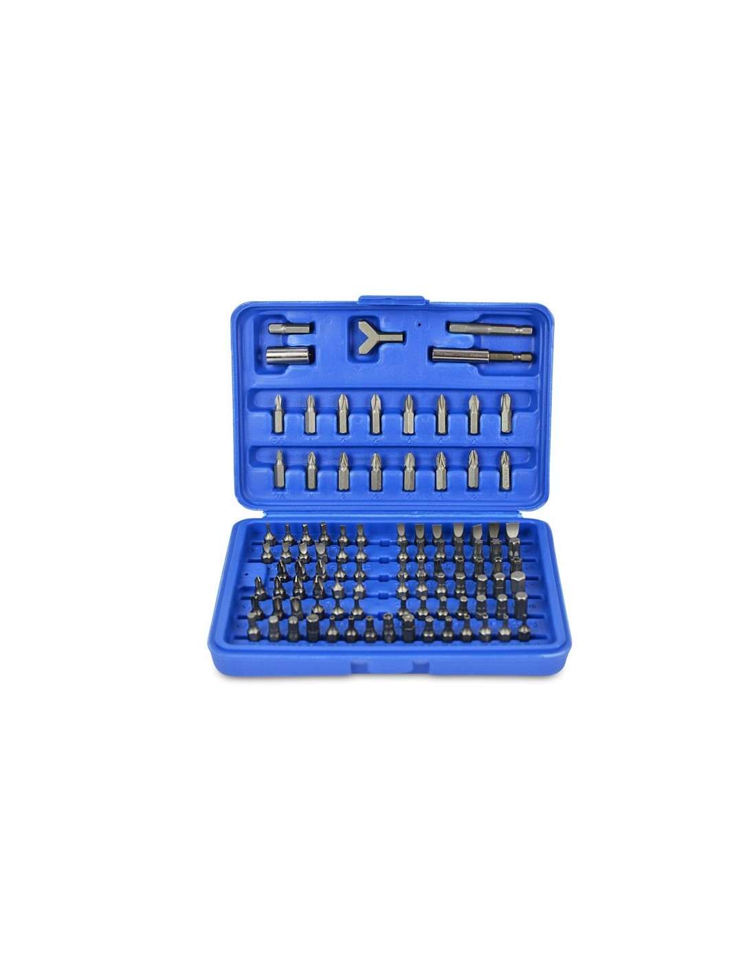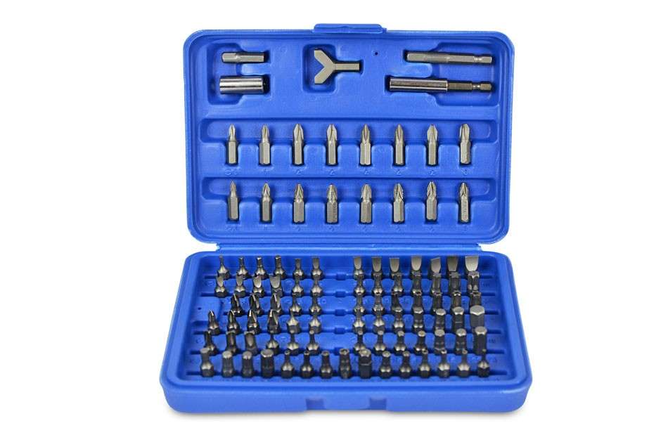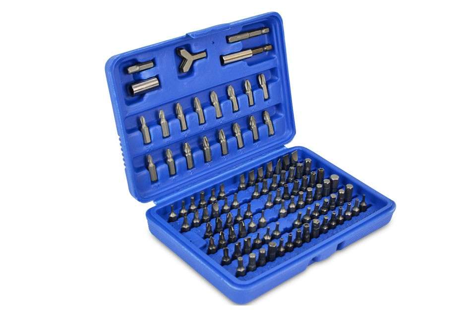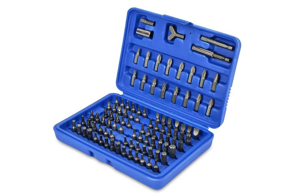 Juego de bits, 25 mm de acero al cromo vanadio, 100 piezas incluidas en un cartucho de plástico. Contiene 1 adaptador 6-4-cuadrado en el borde de 1/4" (6.3 mm), 1 titular poco magnéticos, 1 llave de gancho, 1/16", 5/64", 3/32", 7/64", 1/8"; 9/64", 5/32", 3/16", 7/32", 1/4"; 5/64, 3/32, 7/64, 1/8, 9/64, 5/32; 1.5, 2, 2.5, 3, 4, 5, 5.5, 6, 8 mm; 2, 2.5, 3, 4, 5, 6 mm; T8h, T10h, T15h, T20h, T25h, T27h, T30h, T35h, T40h; T8, T10, T15, T20, T25, T27, T30, T40, T45; 3, 4, 4.5, 5, 5.5, 6, 6.5, 7, 8 mm; 4, 6, 8, 10 mm; 1, 2, 3, 4, 6, 8, 10 c1, c2, c3.5, 6, 8; Ph0, 2 x Ph1, 5 x Ph2, Ph3; Pz0, 2 x Pz1, 5 x Pz2, Pz3; S0, S1, S2, S3.