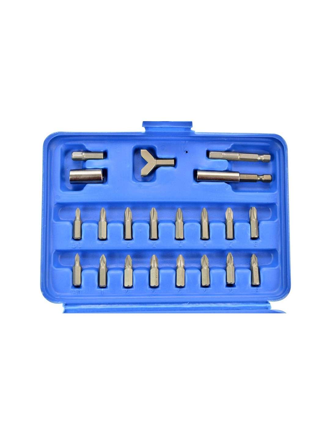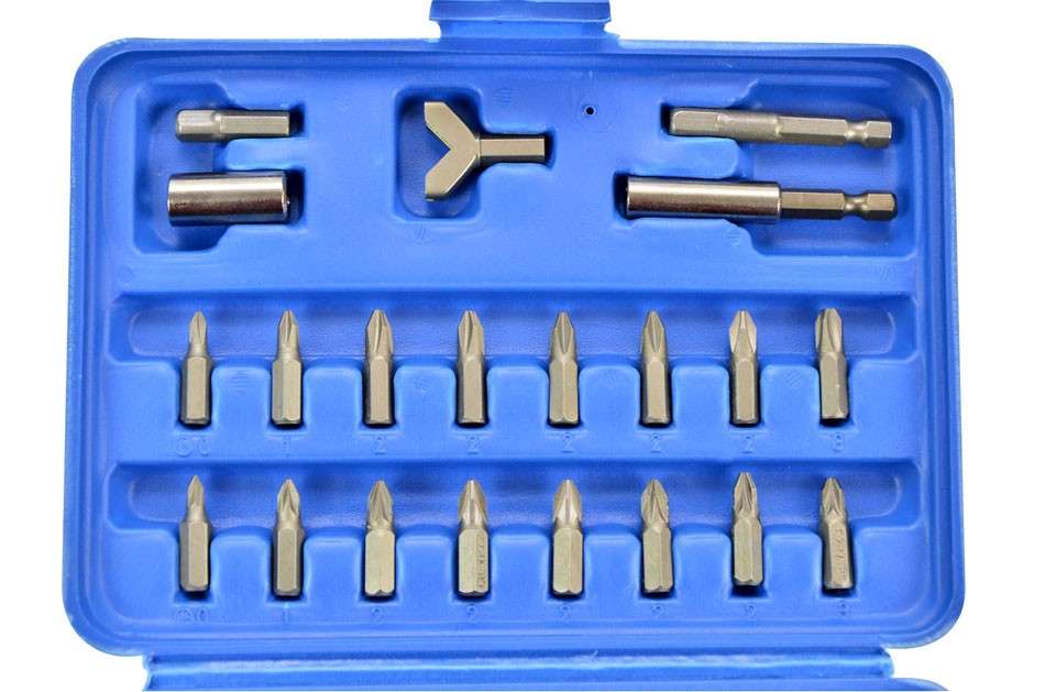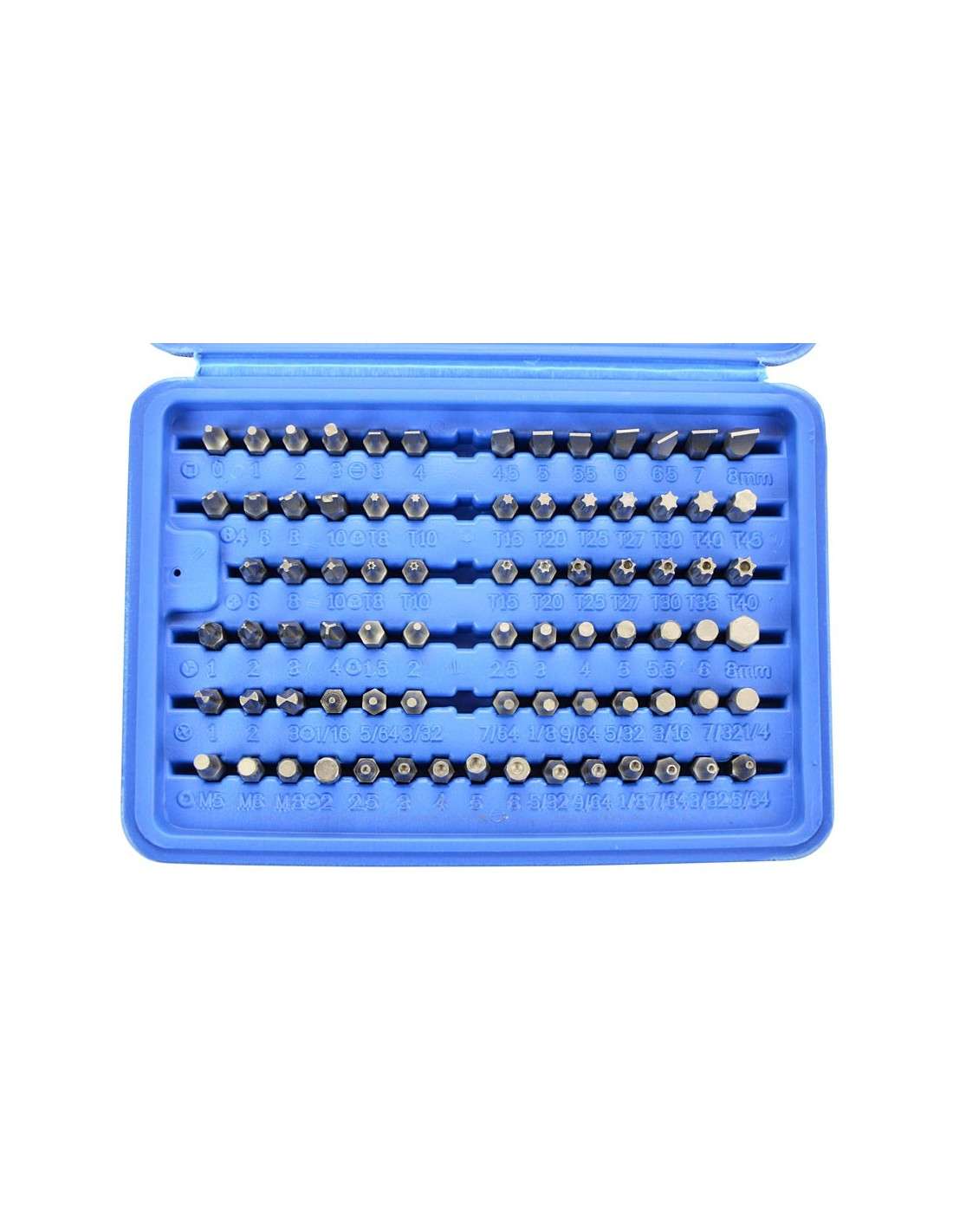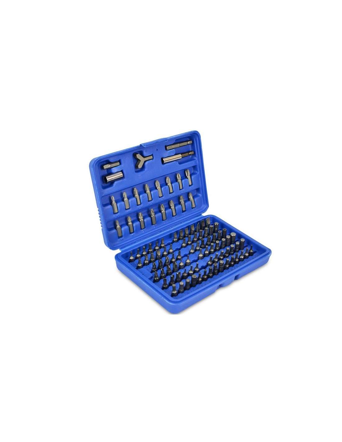 Juego de bits, 25 mm de acero al cromo vanadio, 100 piezas incluidas en un cartucho de plástico. Contiene 1 adaptador 6-4-cuadrado en el borde de 1/4" (6.3 mm), 1 titular poco magnéticos, 1 llave de gancho, 1/16", 5/64", 3/32", 7/64", 1/8"; 9/64", 5/32", 3/16", 7/32", 1/4"; 5/64, 3/32, 7/64, 1/8, 9/64, 5/32; 1.5, 2, 2.5, 3, 4, 5, 5.5, 6, 8 mm; 2, 2.5, 3, 4, 5, 6 mm; T8h, T10h, T15h, T20h, T25h, T27h, T30h, T35h, T40h; T8, T10, T15, T20, T25, T27, T30, T40, T45; 3, 4, 4.5, 5, 5.5, 6, 6.5, 7, 8 mm; 4, 6, 8, 10 mm; 1, 2, 3, 4, 6, 8, 10 c1, c2, c3.5, 6, 8; Ph0, 2 x Ph1, 5 x Ph2, Ph3; Pz0, 2 x Pz1, 5 x Pz2, Pz3; S0, S1, S2, S3.