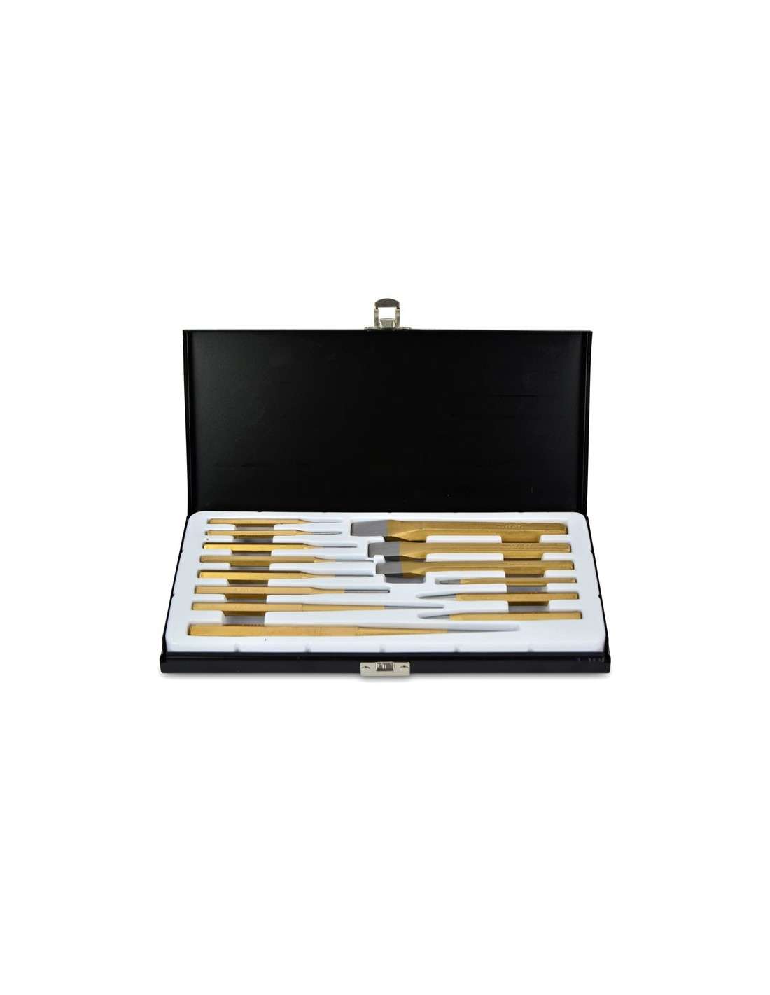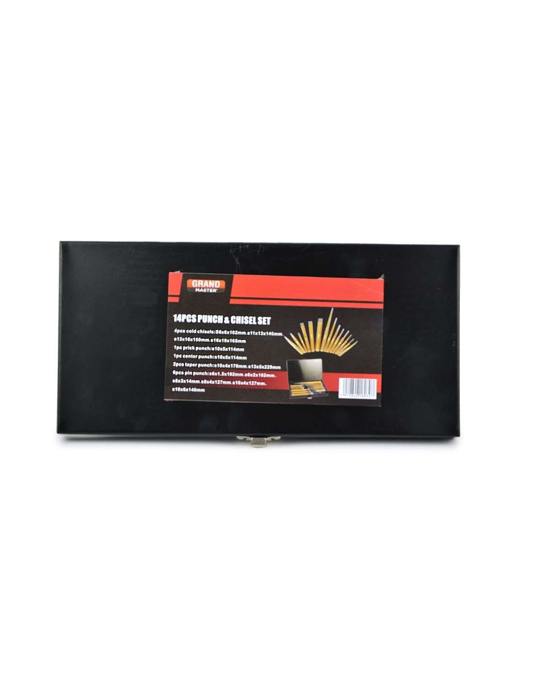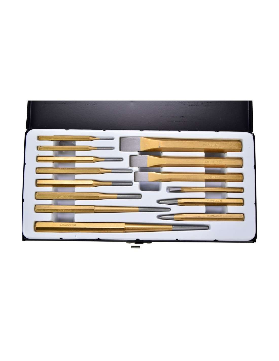 El juego de 14 piezas incluye vástagos hexagonales para un agarre fácil con tenazas de fijación e incluye 5 punzones punta aguda, 5 punzones rectos, 2 centro puntos, 3 cinceles cortafrío y una gubia.